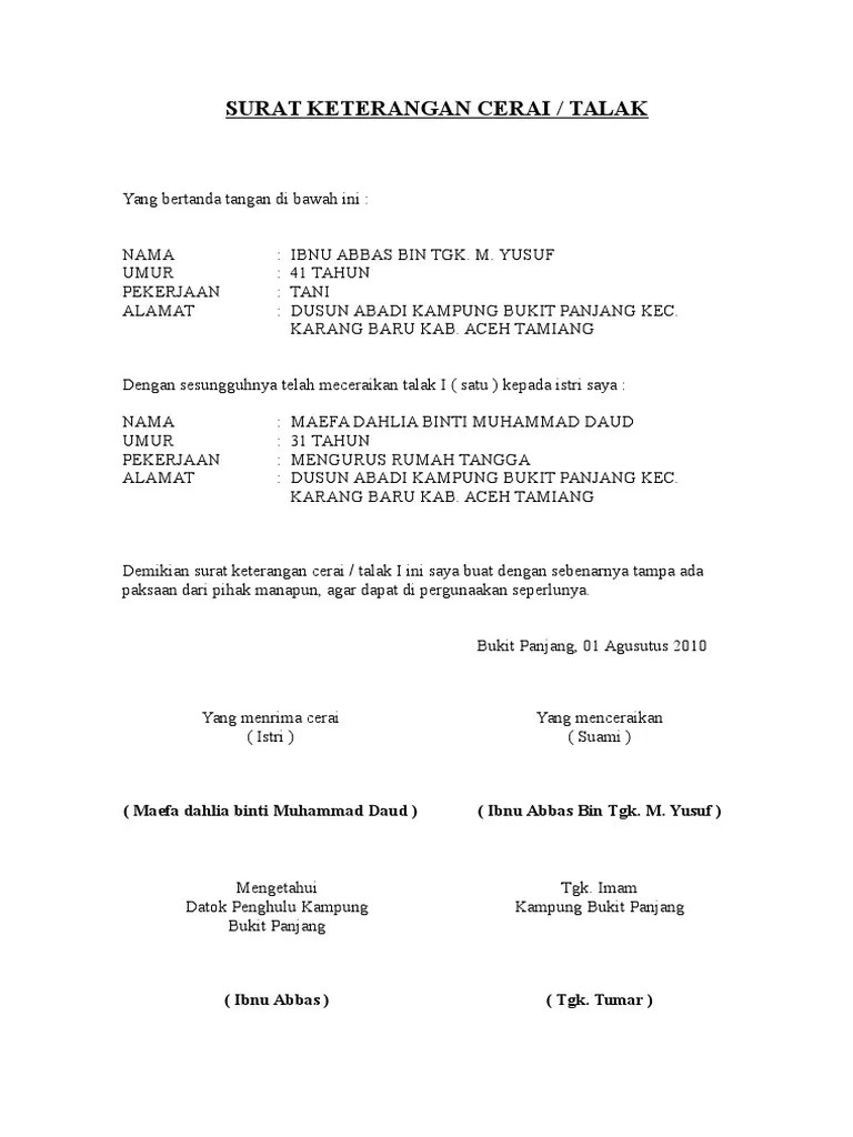 Surat keterangan cerai dari desa adalah surat keterangan yang dikeluarkan oleh kepala desa yang menerangkan status perceraian warganya, baik itu berstatus cerai mati maupun cerai hidup. Contoh surat pernyataan cerai pada umumnya tidak ada orang yang menginginkan perceraian namun pada … Berikut ini contoh surat keterangan perceraian dari pemerintahan desa setempat. Singkatan juga berarti hasil menyingkat memendekkan sehingga akronim. 14.01.2019 · contoh surat keterangan cerai dari kampung. Surat pernyataan cerai yang bertanda tangan di bawah ini menerangkan dengan sesungguhnya bahwa : Kiki ratna dewi tempat / tanggal lahir : Ibu rumah tangga agama : Jakarta, 03 september 1984 pekerjaan : 01.08.2021 · lihat contoh surat pernyataan cerai kampung paling lengkap. Melalui artikel ini, saya tidak hanya memberikan ulasan terbaru terkait contoh surat keterangan cerai dari desa atau surat keterangan pisah suami istri dari desa dalam bentuk doc (word) dan pdf, tapi juga.